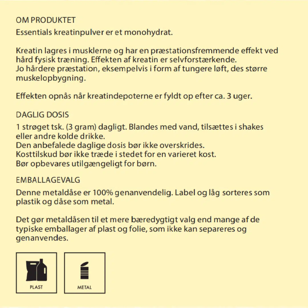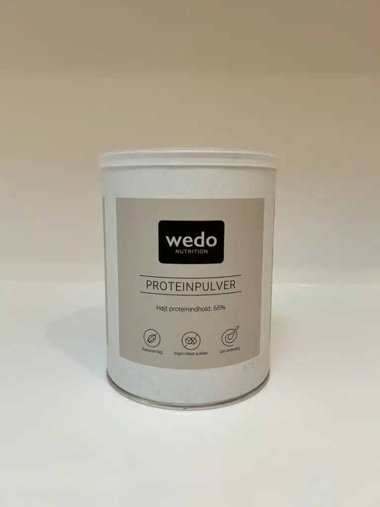 Vi anbefaler 40 gram protein/dag og 3 gram kreatin/dag.